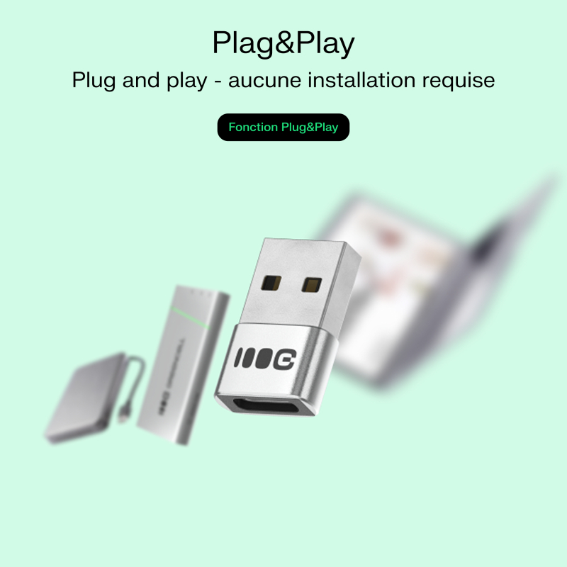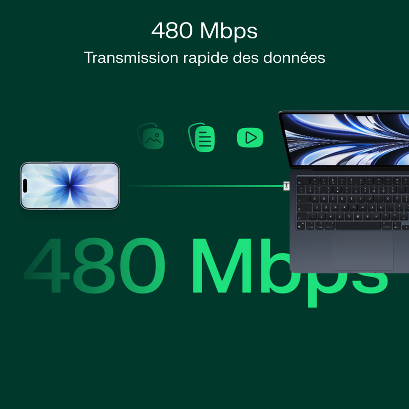 L'adaptateur prend en charge une vitesse de transmission de données allant jusqu'à 480 Mbps, permettant de copier rapidement et facilement des photos, des vidéos ou des documents entre appareils.