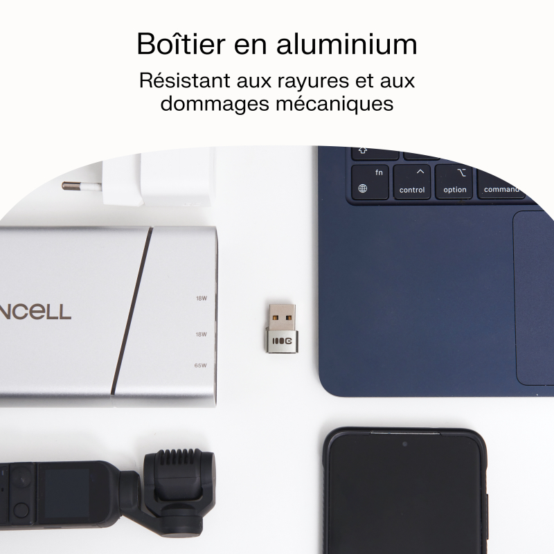 L'adaptateur est fabriqué en aluminium de haute qualité et en matériaux solides, ce qui le rend résistant aux rayures et aux dommages mécaniques. Il assure une fiabilité et conserve un aspect moderne même avec une utilisation intensive. Sa forme simple et moderne fait que l'adaptateur s'intègre parfaitement aux derniers appareils mobiles et ordinateurs.