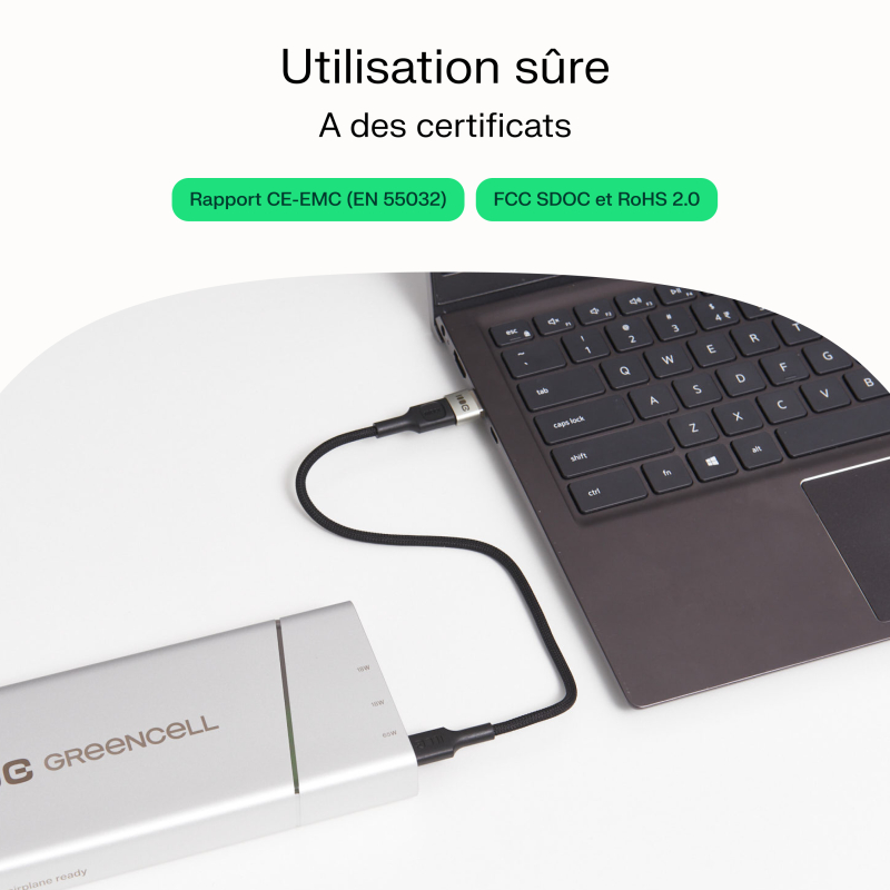 Les adaptateurs sont conçus en Pologne par Greencell et respectent des normes de sécurité strictes. Ils disposent de certificats CE-EMC Report (EN 55032), FCC SDOC et RoHS 2.0, qui confirment leur qualité et leur conformité aux normes.